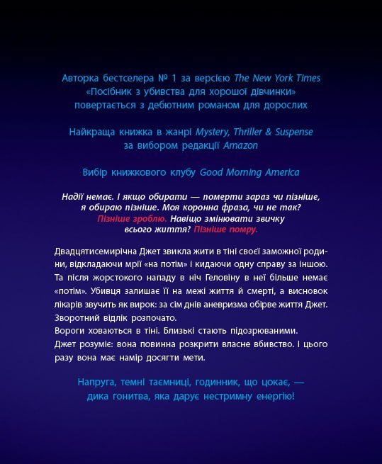Також історію високо оцінив автор бестселера «Мовчазна пацієнтка» Алекс Майклідіс, британсько-кіпрський письменник. Він наголосив, що це «динамічна, захоплива та несподівано зворушлива книжка, справжній майстер-клас з написання трилерів та приклад феноменальної оповіді». З цим відгуком неможливо не погодитися, адже історія про Джет, яка має лише сім днів на розкриття власного вбивства, посідає особливе місце серед світових бестселерів жанру трилер.
