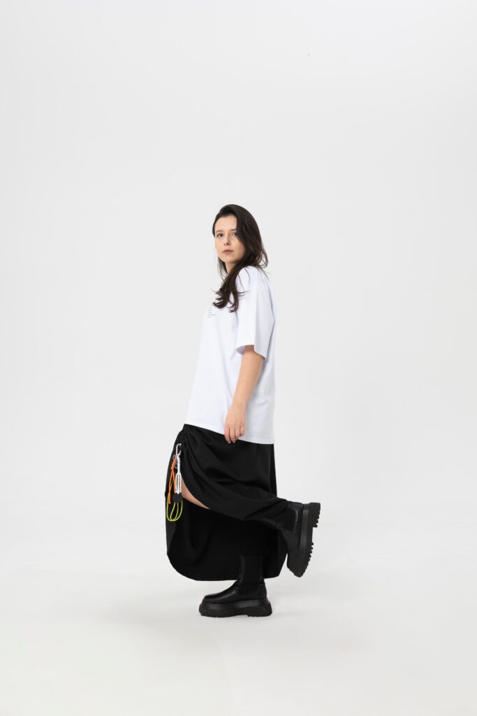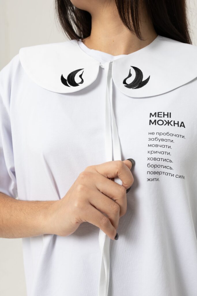 У дропі — футболка з принтом «МЕНІ МОЖНА», комірець, що додає сміливий акцент до базових образів, помаранчевий брелок та шопер із лаконічним меседжем підтримки. Мінімалістична естетика FMK поєднується із соціальною позицією — колекція створена як спосіб підтримати людей, які пережили насильство.