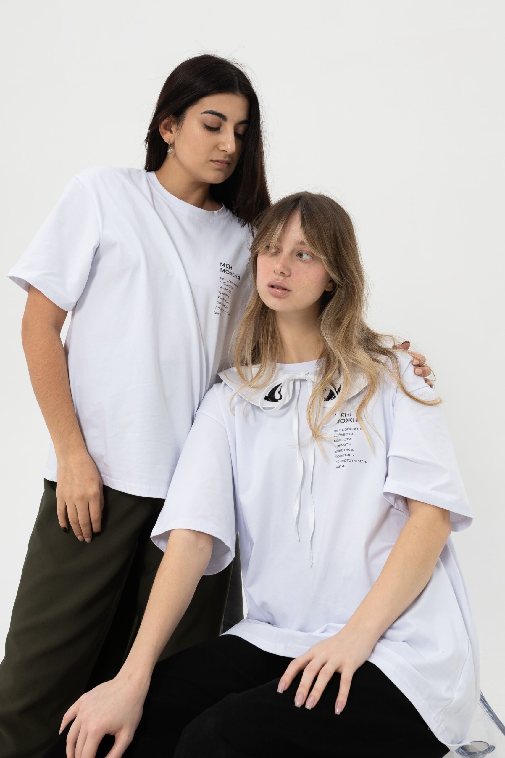 У дропі — футболка з принтом «МЕНІ МОЖНА», комірець, що додає сміливий акцент до базових образів, помаранчевий брелок та шопер із лаконічним меседжем підтримки. Мінімалістична естетика FMK поєднується із соціальною позицією — колекція створена як спосіб підтримати людей, які пережили насильство.