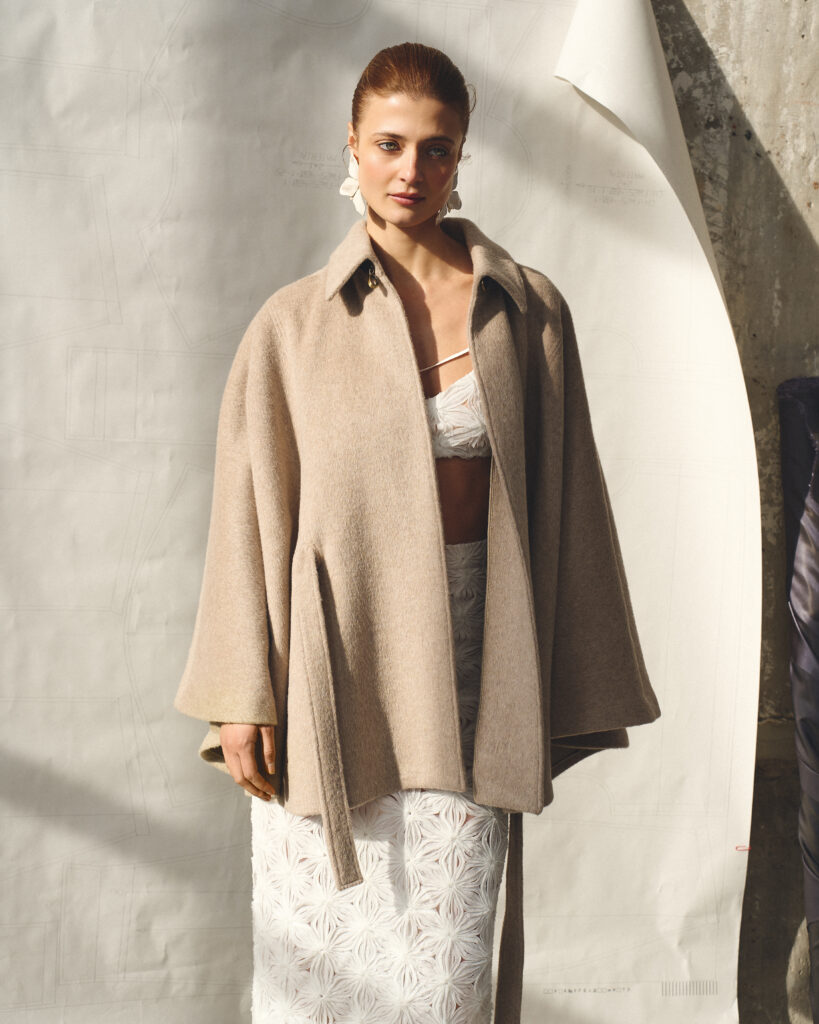Колекція побудована на поєднанні чітких силуетів та делікатності: обʼємні форми пом’якшуються делікатними тканинами, щільні поверхні – напівпрозорими шарами. Ця тенденція зберігається в усіх образах: від графічних жакетів зі скульптурною лінією плеча до майже невагомих комплектів із фактурного текстилю.