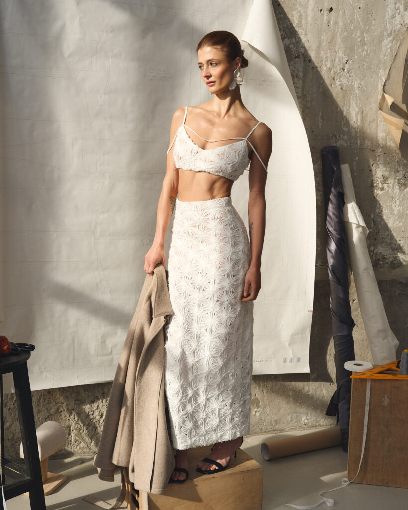 Ключовими матеріалами колекції стали текстуровані тканини з рельєфною поверхнею. Білий комплект із топом і спідницею демонструє складну роботу з фактурою, де об’ємна структура тканини створює особливу глибину виробів. Сучасний тейлоринг представлений у сірому костюмі з асиметричною мініспідницею, в якому класична тканина та стриманий колір набувають нового звучання завдяки крою й продуманим пропорціям.