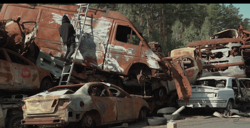 • Фрагменти автівки, що наче янгол вивозила людей з окупованих Бучі та Ірпеня, із зображеним на ній малюнком «Янголи, що затримують ракети». Цей арт-об’єкт був створений художником BANDIT у вересні 2023 року.
