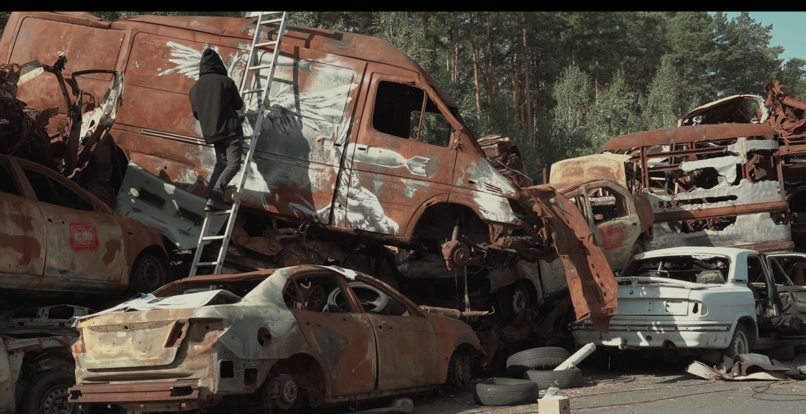 • Фрагменти автівки, що наче янгол вивозила людей з окупованих Бучі та Ірпеня, із зображеним на ній малюнком «Янголи, що затримують ракети». Цей арт-об’єкт був створений художником BANDIT у вересні 2023 року.
