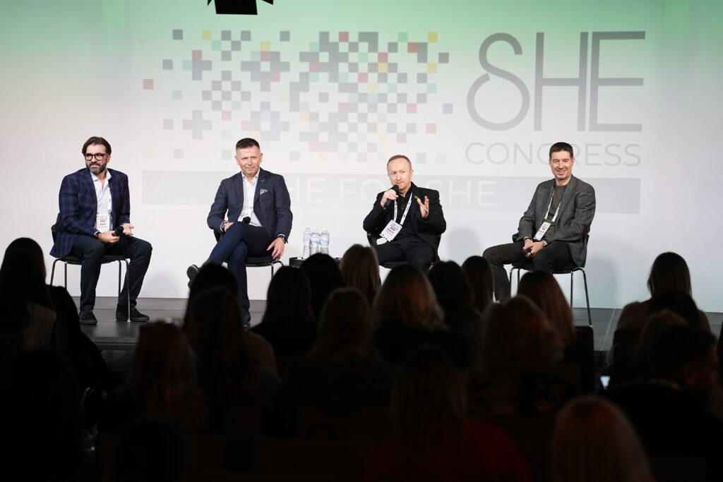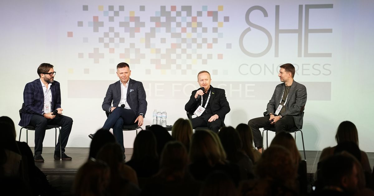 17 грудня 2025 року She Congress став майданчиком для однієї з найбільш очікуваних подій року — панельної дискусії He for She. У залі, де зібралися сотні успішних жінок, чоловіки-топменеджери провідних компаній України вийшли на відверту розмову про те, як гендерна різноманітність трансформує бізнес, чому жіноче лідерство є критично важливим під час війни та які якості вони найбільше цінують у своїх колегах жінках. Учасники дискусії: Сергій Наумов — голова правління АТ «Ощадбанк»; Владислав Антипов — власник та СЕО екологічної компанії ЦЕРН; Сергій Мартинчук — генеральний директор Cisco Ukraine; Юрій Кляцкін — засновник Школи Імпровізації Кляцкіна (модератор та спікер).