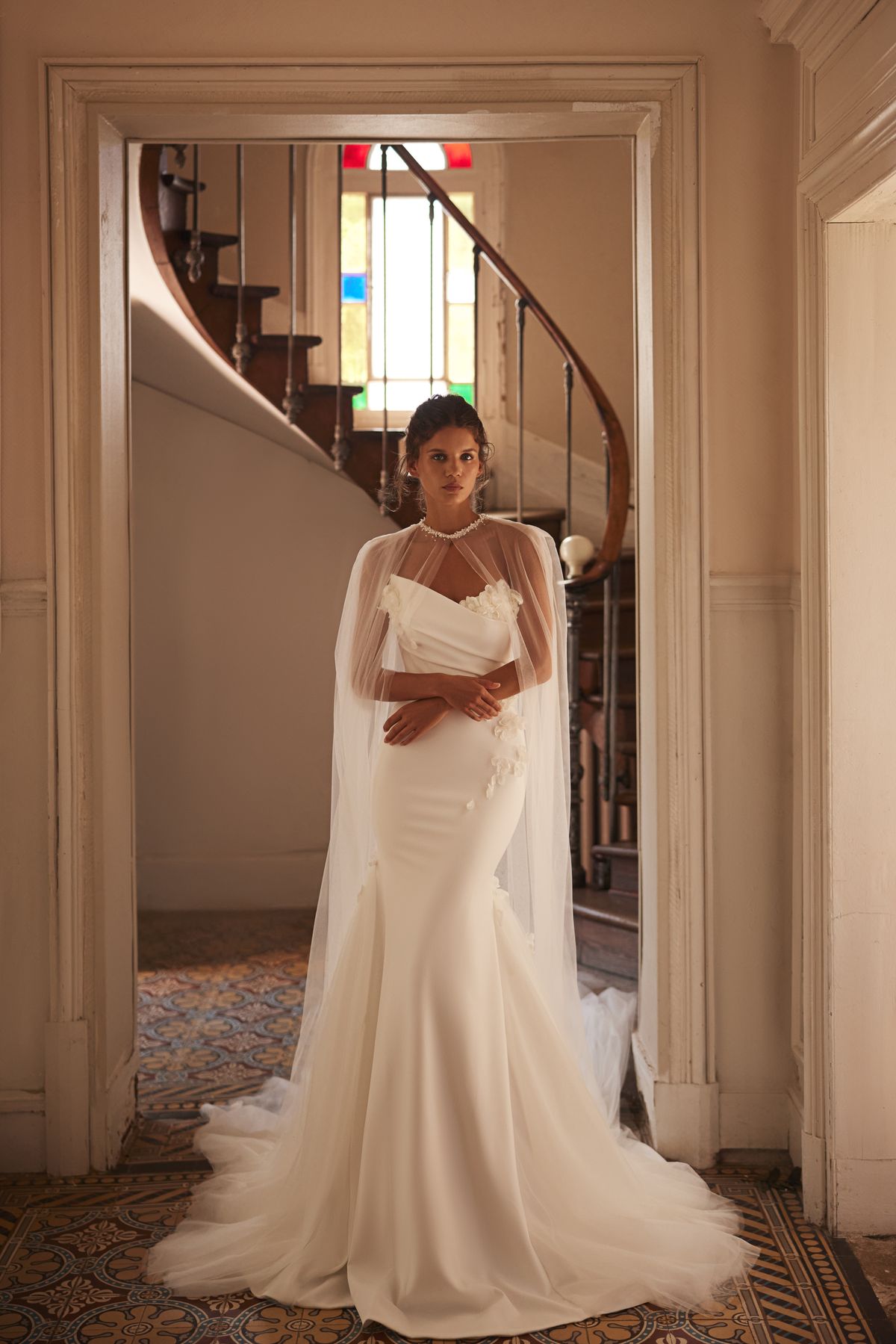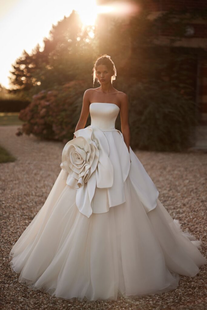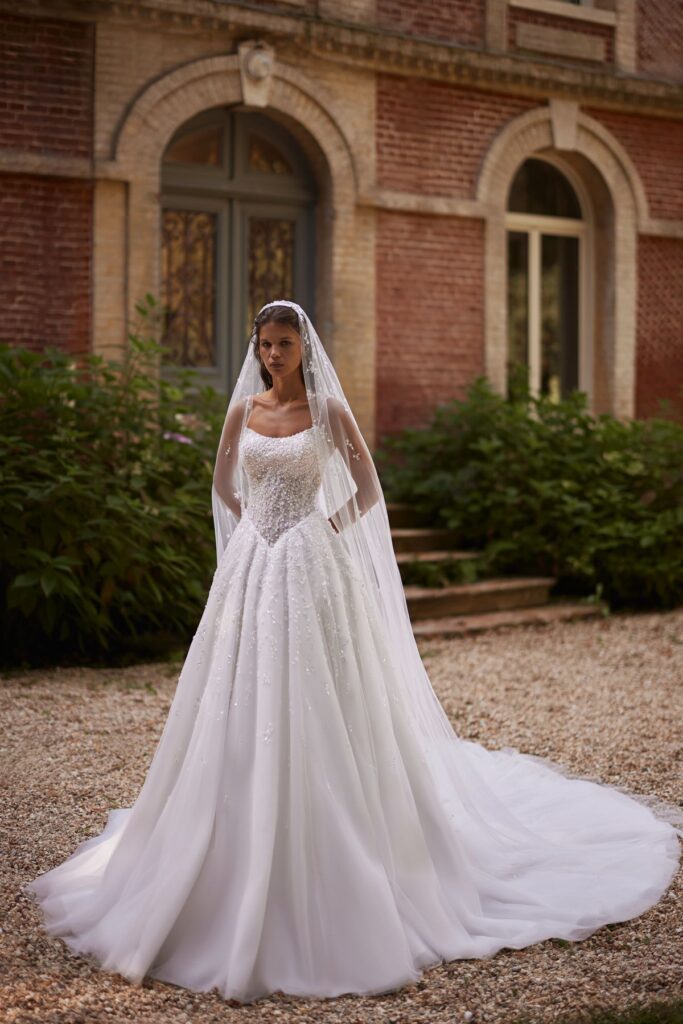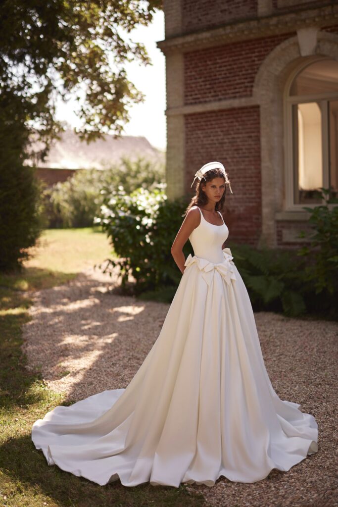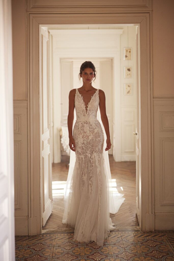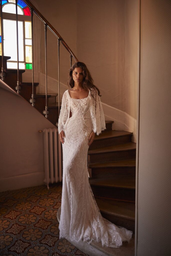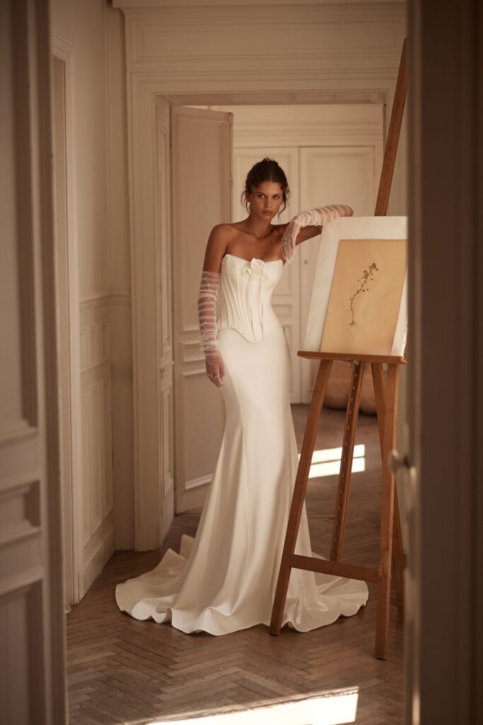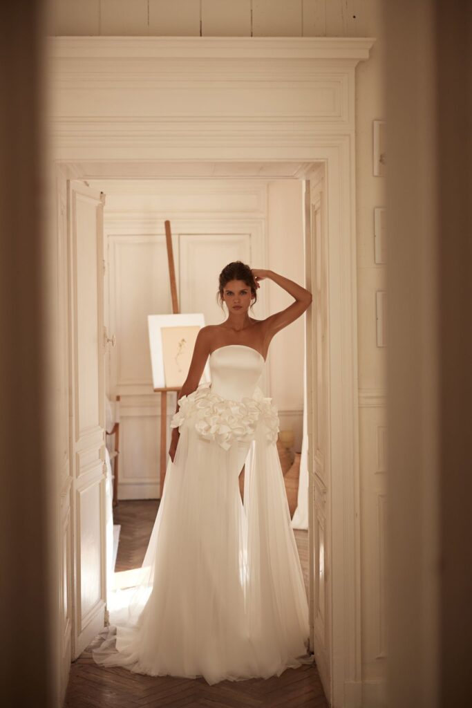 Колекція відображає цю атмосферу у сучасній весільній естетиці. М’які силуети, чисті лінії крою та делікатна ручна робота створюють відчуття руху і легкості. Кожна сукня, як саме нормандське світло, змінюється з різних ракурсів, відкриваючи нові грані жіночності.