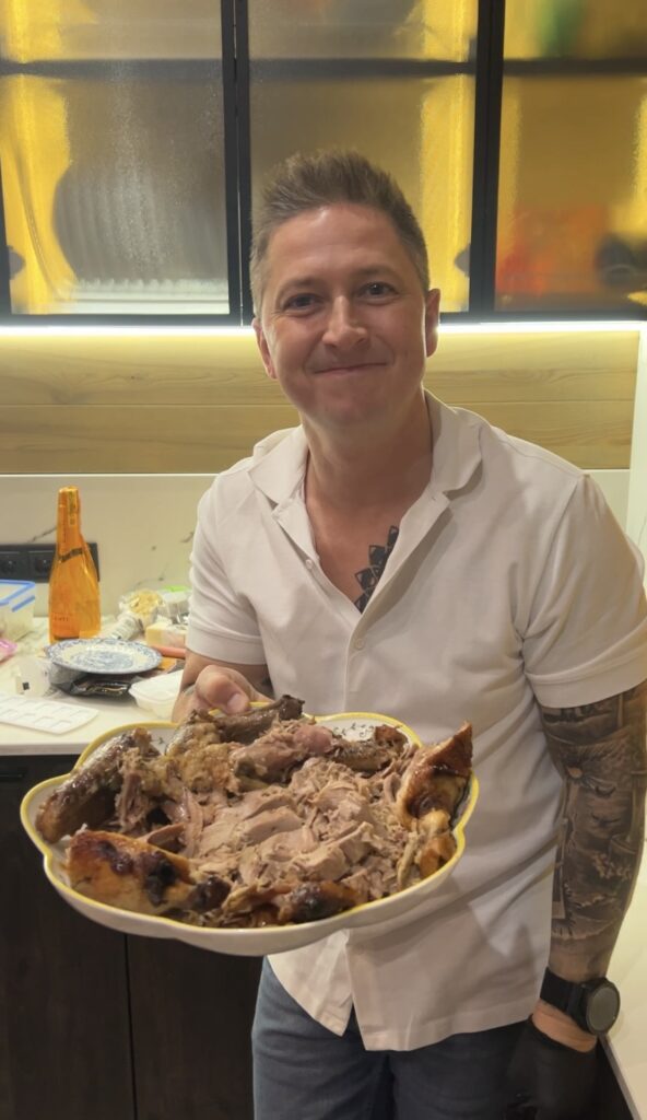– Я дуже люблю готувати для своєї родини. Зазвичай це сніданки! Моє фірмове – гуакомоле на тості хліба та яєшня-скрембл, – розповідає Педан. – Інколи готую обід чи вечерю. Тут фірмове – карамелізовані курячі сердечка. Влітку, коли ми з сім’єю мешкаємо на дачі, на вогні роблю рибну юшку або плов. Але зараз хочу поділитися з вами особливою стравою! Її готуємо рідко, але, насправді, це один з улюблених рецептів у житті. Фірмова качка від бабусі моєї дружини, яку ще трішечки удосконалила моя дружина. А готую я зазвичай під чітким керівництвом коханої.