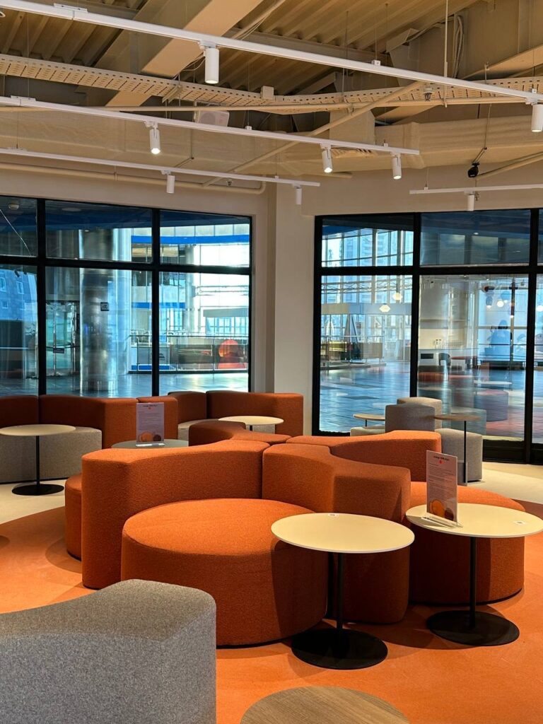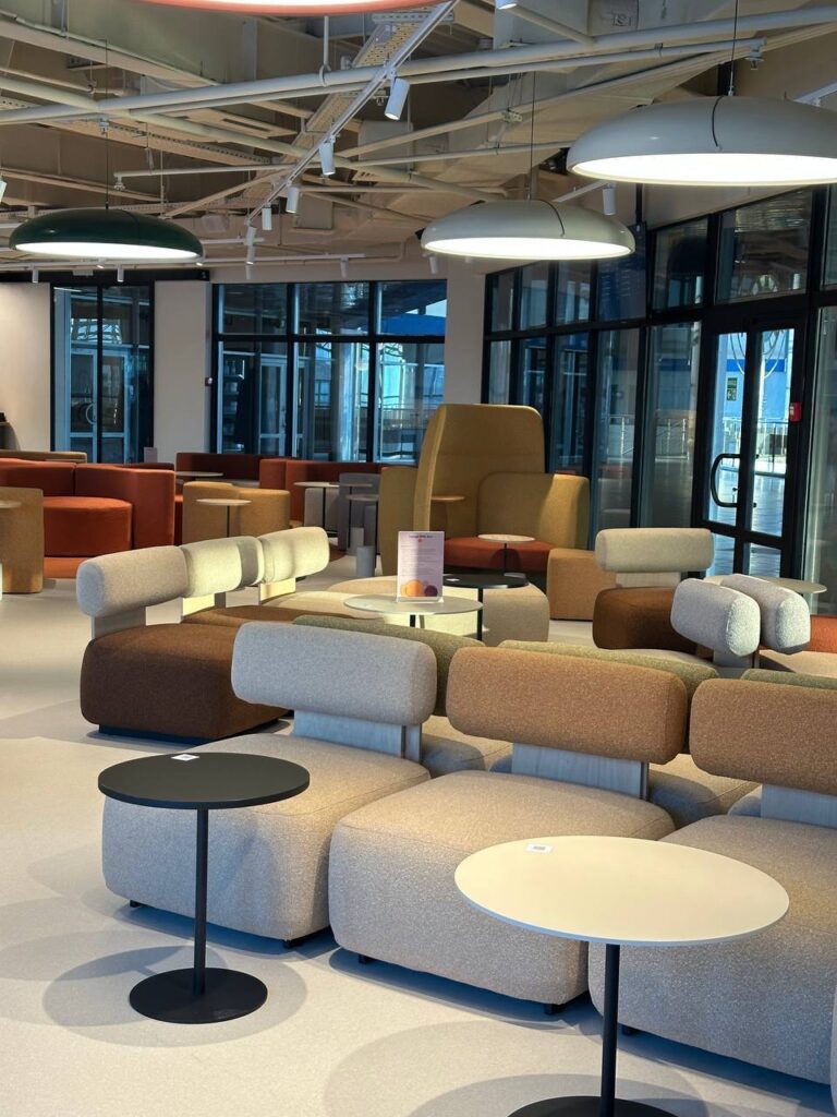 Інфраструктура для роботи та відпочинку: у лаунжі доступний високошвидкісний Wi-Fi та 21 розетка для зарядки ноутбуків, телефонів та інших пристроїв. Простір облаштовано зручними місцями для роботи чи відпочинку.