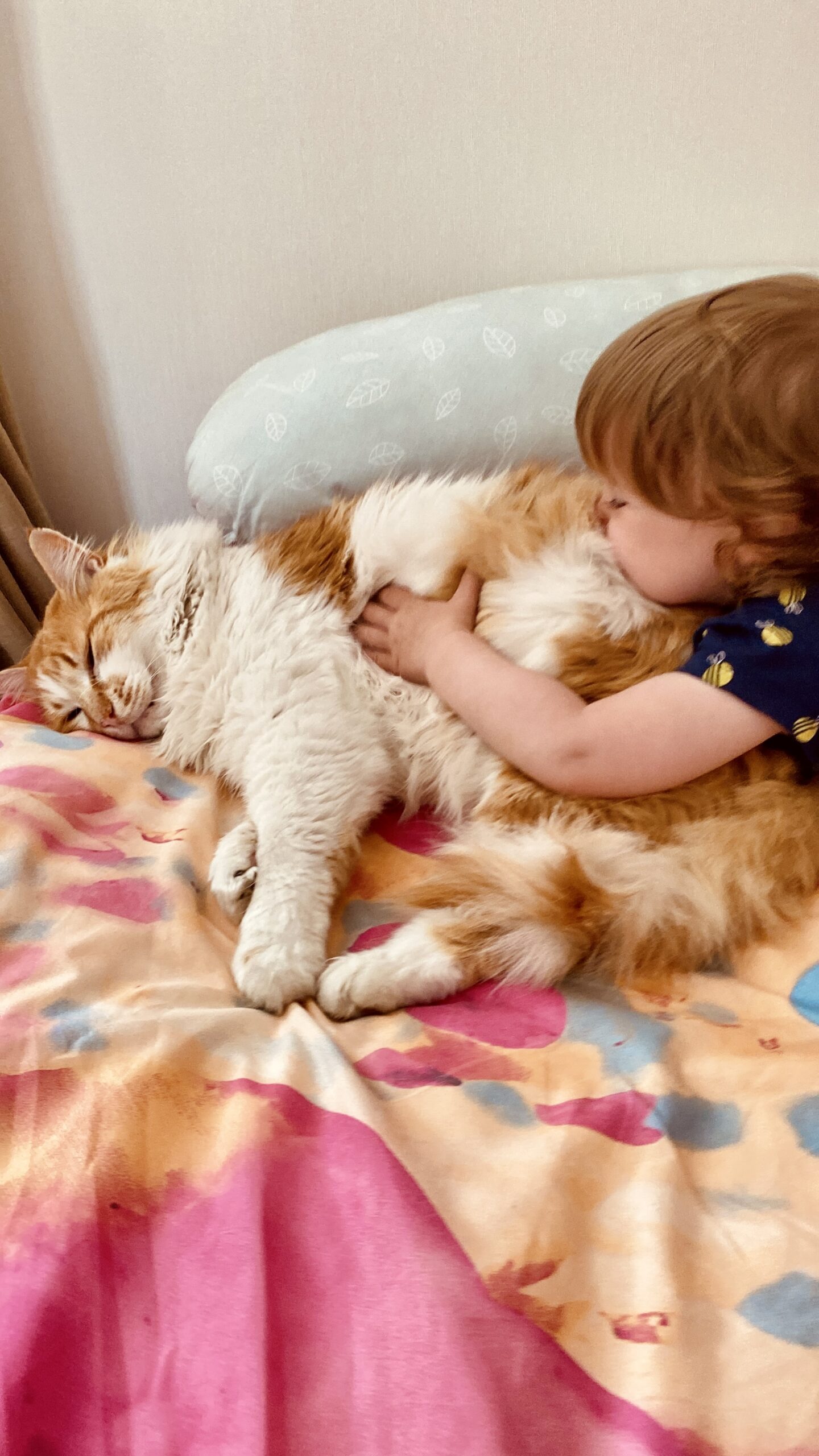 Рижий терпляче переносить усі прояви ніжності Ксенії: від обіймів до «лікування», переодягання і ще колискових. У нас навіть є щоденна рубрика «Терпи, котику, тебе люблять». Це про розчесати, погладити, полюбити, послухати, як муркоче, укрити простирадлом, покачати в ліжечку, а віднедавна ще й полікувати Рижого від усього одразу усім, що є у лікарській валізці.