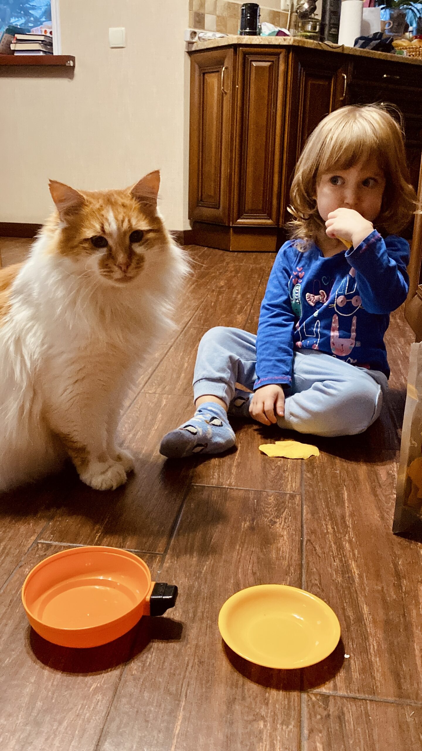 І так, корм котячий Ксенія теж іноді дегустує. Переважно, сухий. І хай не нервують недосвідчені батьки і годувальники котів і дітей, ні один із них не постраждав. Ну, хіба, Рижий, що його об”їдають. Але точно компенсують обіймами, хай навіть і примусовими, колисковими і ляльковому ліжечку і запрошеннями на кшталт: “Рижий, іди до нас малювати”.