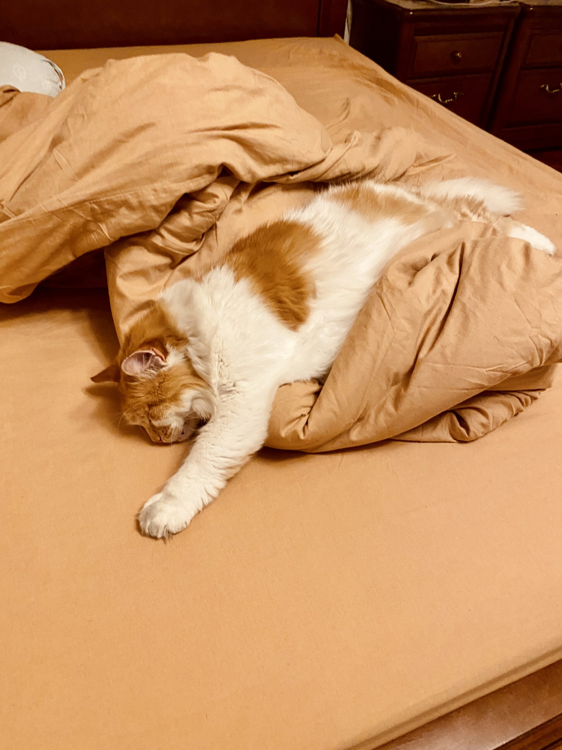 Спершу Рижому не можна було на ліжко і диван, а місце його було на рушнику на підлозі. Недовго, звісно. Тепер Рижий може впертися в стіну лапами, розпрямити їх і випхати тебе з дивана. Але вже у нього є лежанка, кігтеточка і кілька власних коробок. І місце на кожному ліжку в хаті.