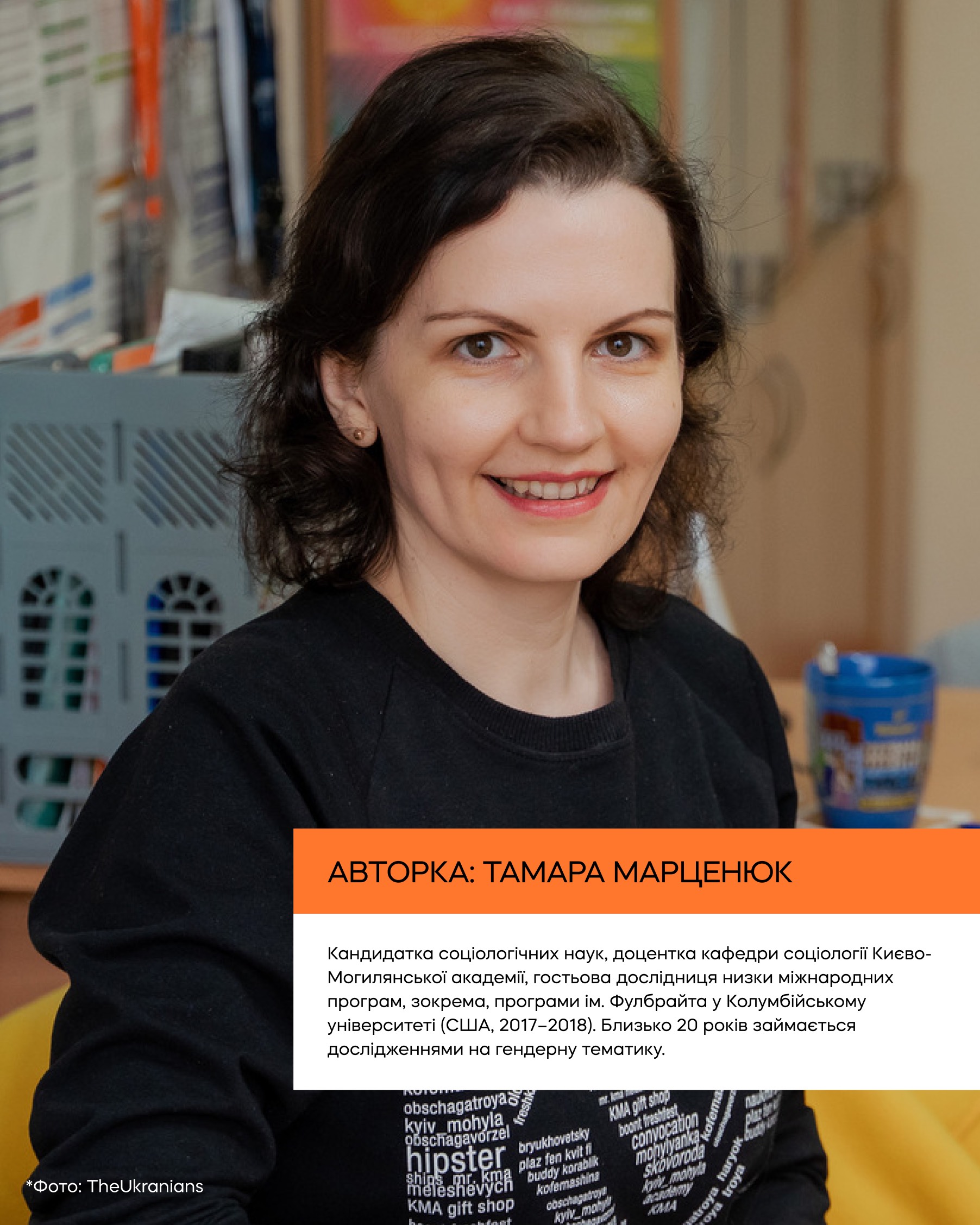 Тамара Марценюк — кандидатка соціологічних наук, доцентка кафедри соціології Києво-Могилянської академії, майже 20 років займається дослідженнями на гендерну тематику.