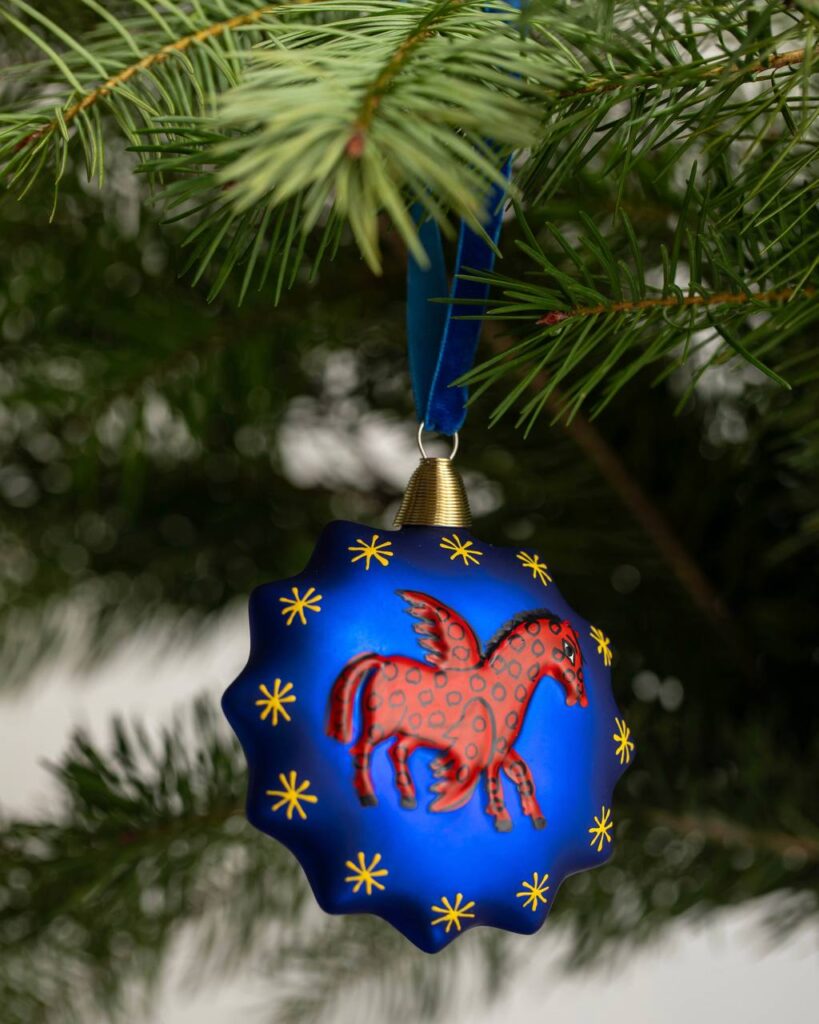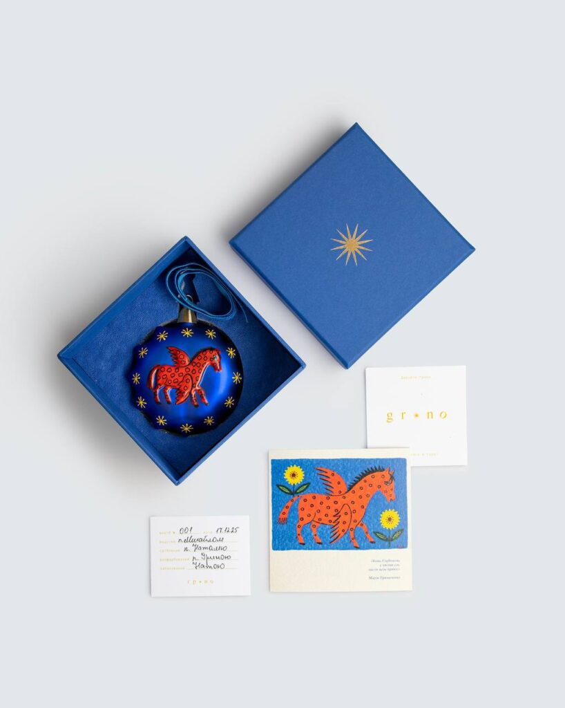 Для тих, хто є великим поціновувачем прикрас для новорічної ялинки — показуємо прикрасу «Крилатий коник» — колекційну іграшку за мотивами полотна Марії Примаченко «Конь-Горбоконь у квітки сів, щастя всім приніс» від бренду «Ґроно».