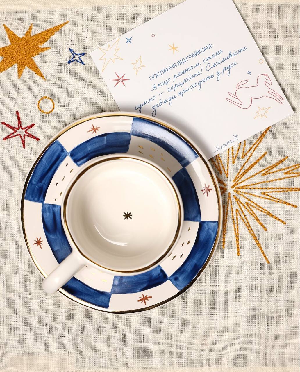 «Грайкінь» — це новорічна колекція бренду Serve it. Міні колекція допоможе прикрасити простір навколо. До неї увійшли ранер, набір серветок та чашка з блюдцем з зображенням символу наступного року коня.