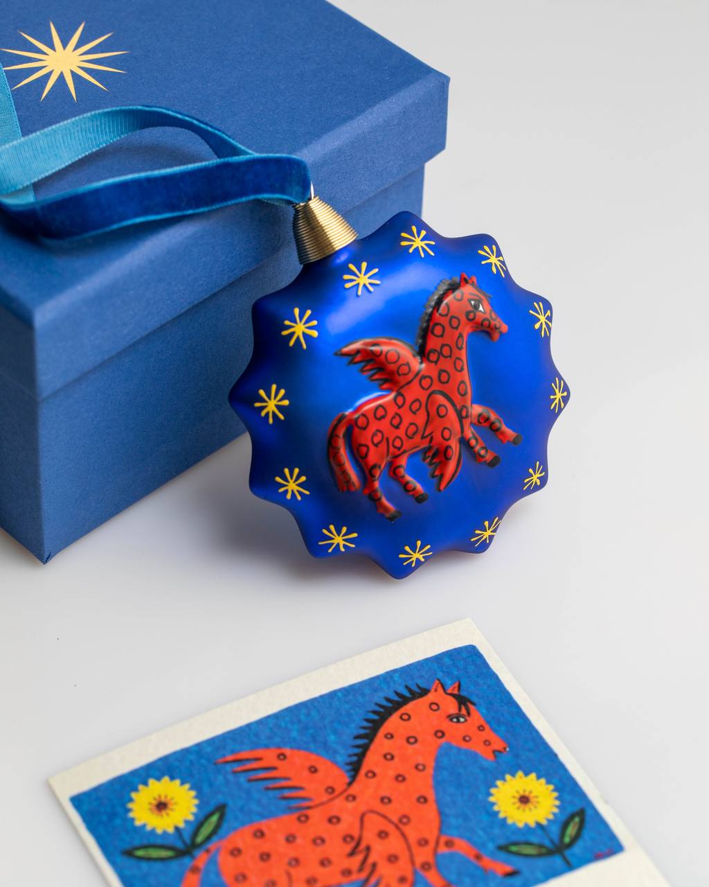 Для тих, хто є великим поціновувачем прикрас для новорічної ялинки — показуємо прикрасу «Крилатий коник» — колекційну іграшку за мотивами полотна Марії Примаченко «Конь-Горбоконь у квітки сів, щастя всім приніс» від бренду «Ґроно».