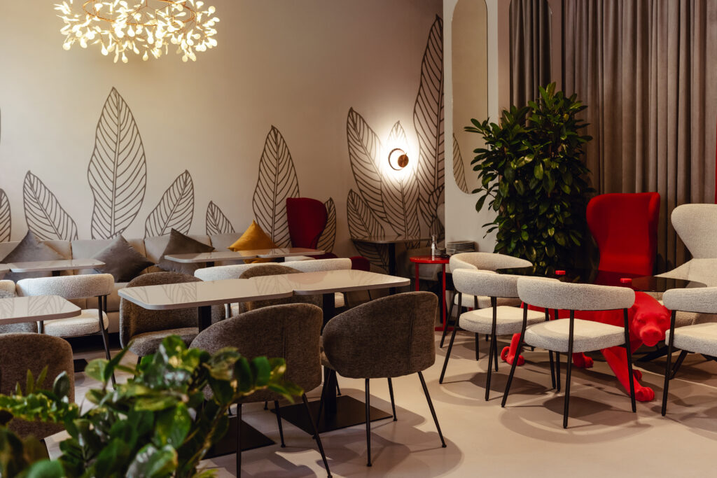 Дизайн створила архітекторка й дизайнерка інтер’єру Ольга Дзюба. Серед її проєктів: ресторан паназіатської кухні Guramma та ресторан італійської кухні Corvina. Всередині кафе поєднує жовті та бордові відтінки та яскраві акценти – триметровий жираф, ілюстрації з тваринами й рослинними мотивами. Заклад позиціює себе як pets friendly простір.