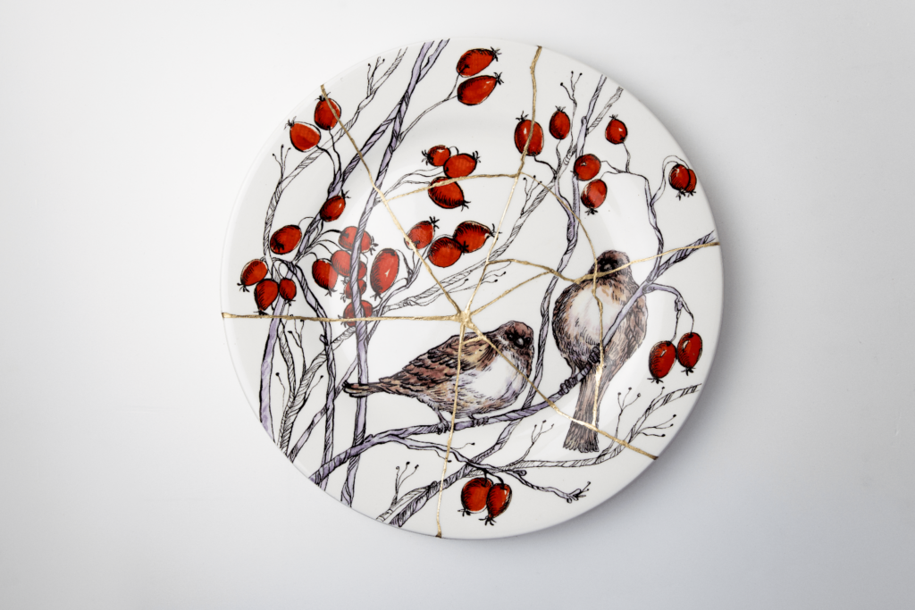- Відновлення здійснено вручну в техніці кінцуґі – традиційному японському методі реставрації кераміки, що передбачає склеювання фрагментів із акцентуванням швів. Це продовження символіки проєкту “Гастросенси”, у візуальній айдентиці якого вже використовувався мотив склеєних уламків як метафора травми та її переосмислення.