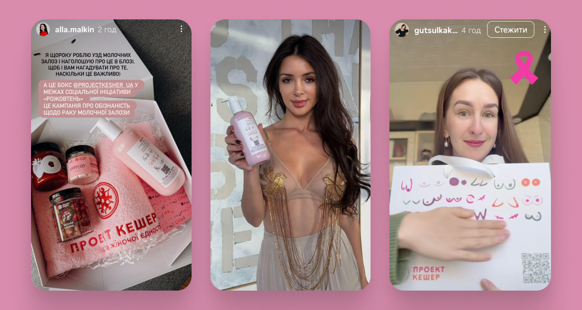 «Проект Кешер» долучив до інфокампанії 31 українську інфлюенсерку, аби щодня з 1 по 31 жовтня у соцмережах з’являлися переконливі нагадування про чекап для жінок. Для цієї соціальної ініціативи «Проект Кешер» розробив спеціальний Pink Box з матеріалами, інструкцією з самообстеження та приємними речами для здорового «Рожовтня» — крем-медом з полуницею, чаєм з бутонів троянд, баттером для тіла, м’яким рушником та листівкою, яка нагадує, що жіночі груди будь-якої форми та розміру є прекрасними. Ключовим елементом цього набору став гель для душу з етикеткою, яка містить покрокову інструкцію для самообстеження грудей. У власній ванній кожній жінці зручно зробити цей огляд швидко та комфортно.