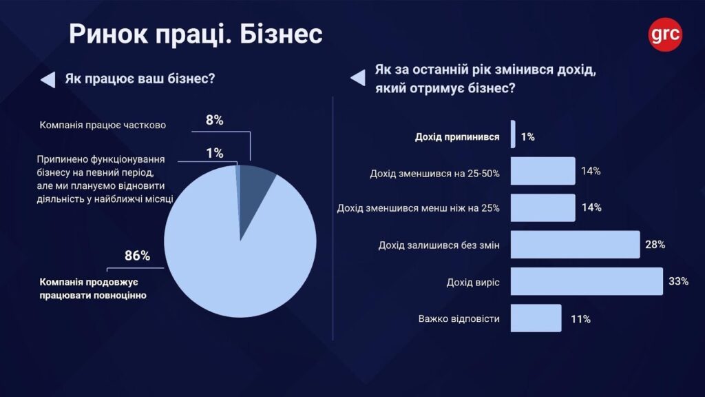Як показали результати всеукраїнського щорічного дослідження «Барометр Ринку праці», проведеного компанією GRC.ua наприкінці минулого року, 91% компаній продовжують працювати у повному обсязі. Цей показник фіксує подальшу стабілізацію, адже це на 5% більше, ніж роком раніше.