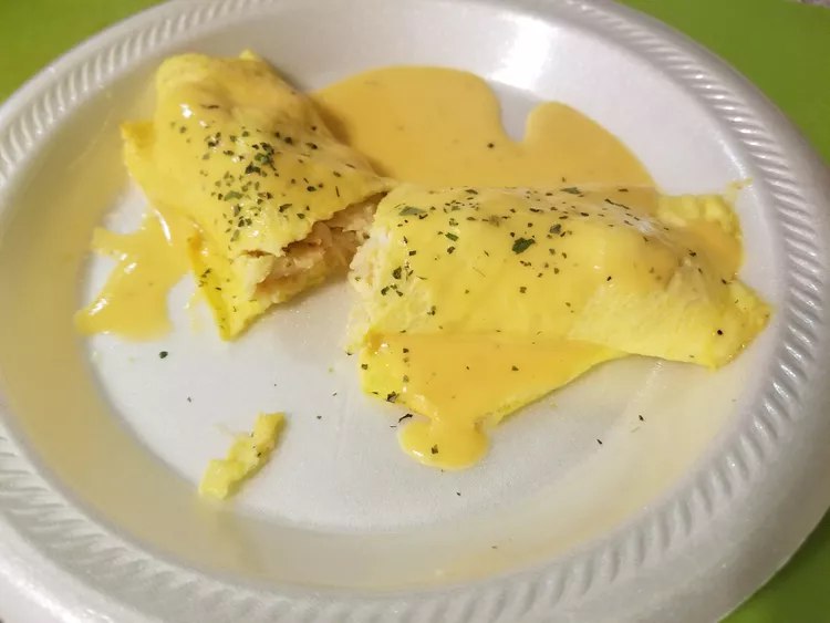 Вилийте приблизно 1/4 склянки яєчної суміші на гарячу сковороду; перемішайте, щоб утворився тонкий, рівний шар яйця. Готуйте, доки воно не стане твердим, потім переверніть і готуйте ще кілька секунд, щоб інший бік став твердим. Викладіть 1/6 начинки з морепродуктів на нижню половину омлету, потім згорніть як рол. Повторіть цей крок з рештою яєчної суміші. Подавайте 2 омлети, политі сирним соусом, на особу.