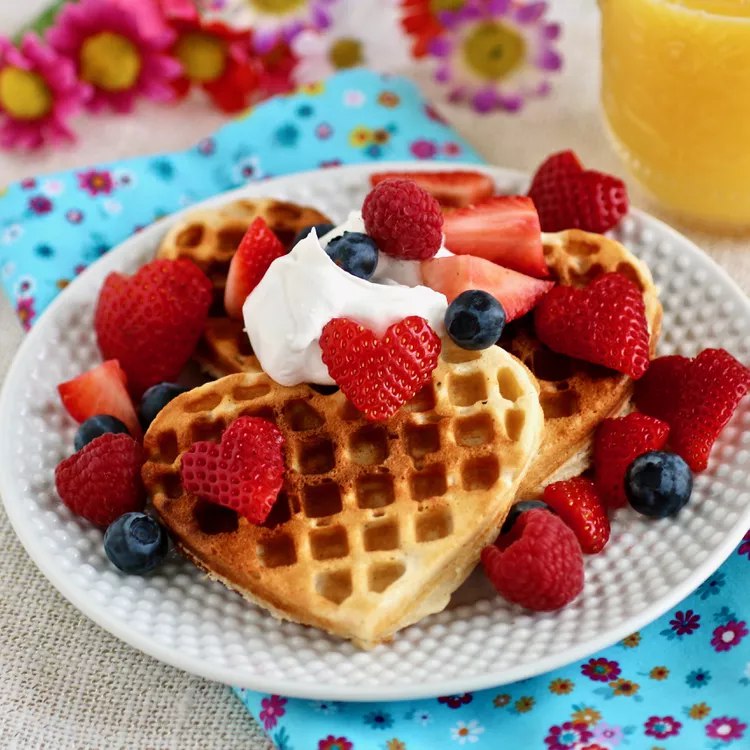 Викладіть приблизно 1/3 склянки тіста в розігріту вафельницю, закрийте кришку та готуйте, поки вафля не стане золотисто-коричневою, приблизно 5 хвилин. Вийміть вафлю на тарілку. Якщо використовуєте вафельницю у формі серця, розламайте вафлю на окремі сердечка перед подачею. Повторіть з рештою тіста.