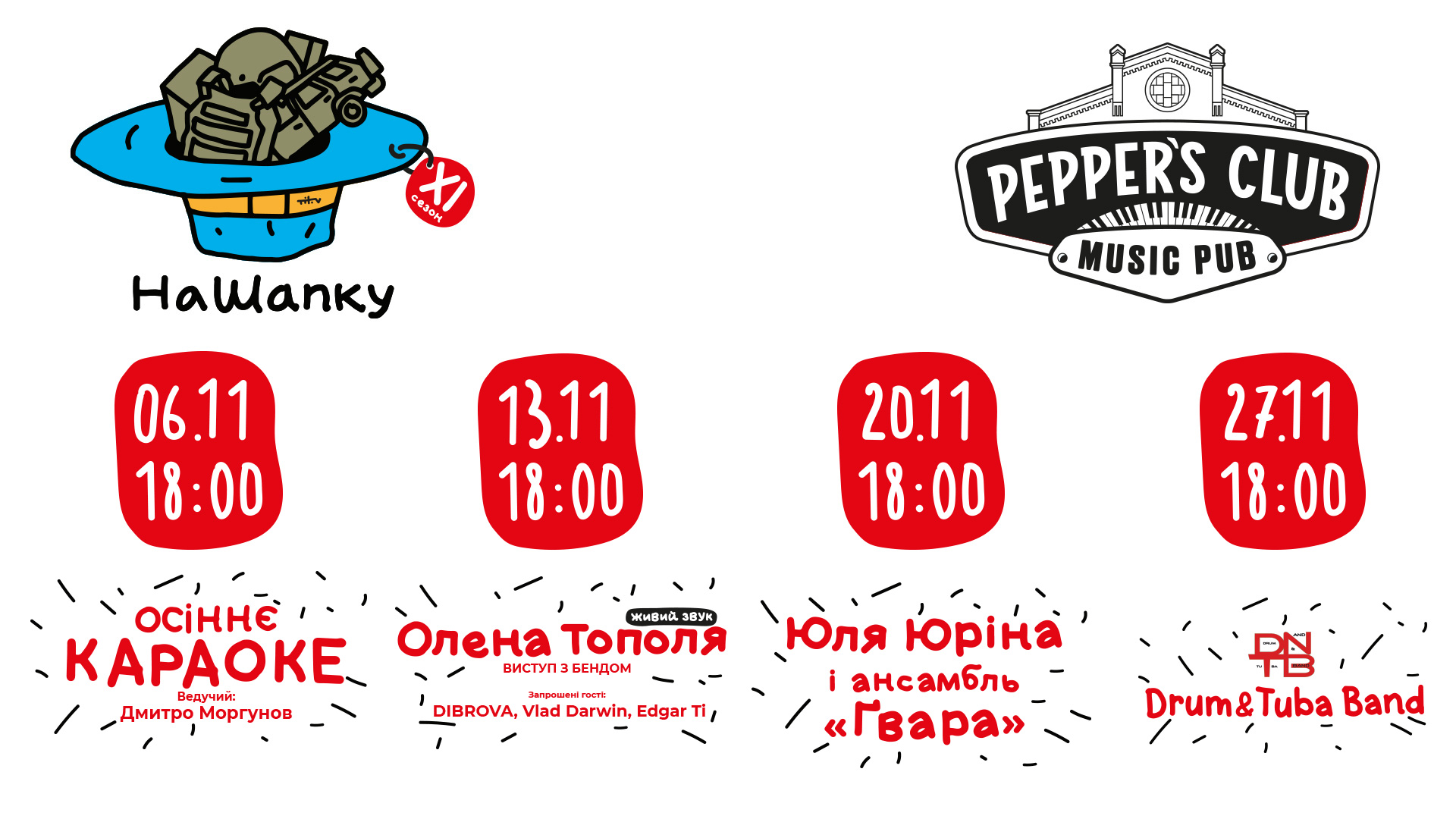 У листопаді Pepper’s Club продовжує серію благодійних заходів #НаШапку: 6 листопада відроджуватимуть традицію караоке з ветераном і ведучим Дмитром Моргуновим, 13-го відбудеться виступ Олени Тополі з живим бендом, 20-го — Юля Юріна разом із етноансамблем «Ґвара», а 27-го — вибухові Drum&Tuba Band. Вхід вільний, а всі донати спрямують у фонд «СВОЇ» на кісткові імпланти та медичну допомогу пораненим захисникам.