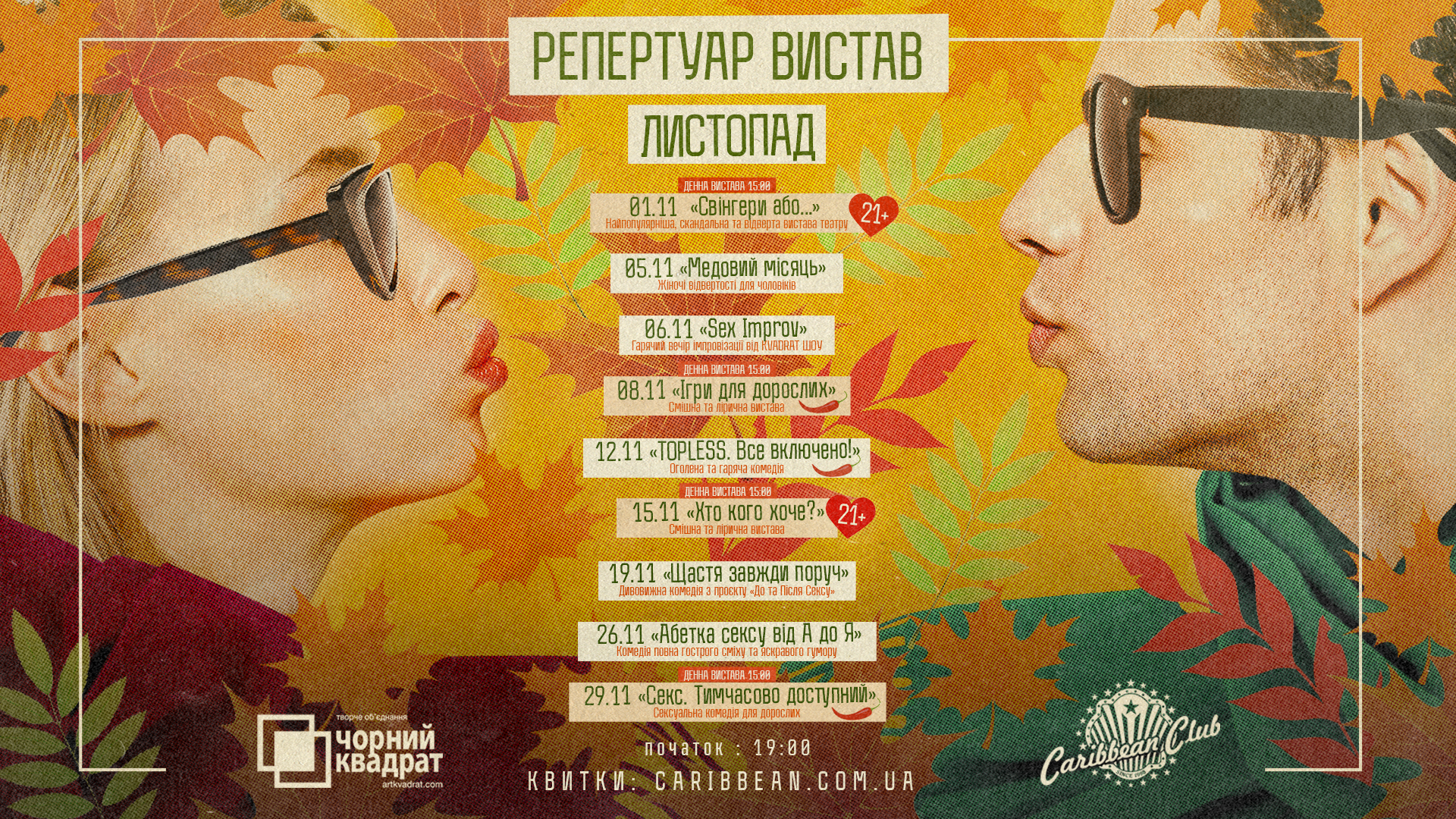 У листопаді на сцені Caribbean Club — вистави театру «Чорний Квадрат», відомого своїм відвертим гумором і гострими сюжетами. У програмі — історії про кохання, секс, стосунки та пошуки себе.