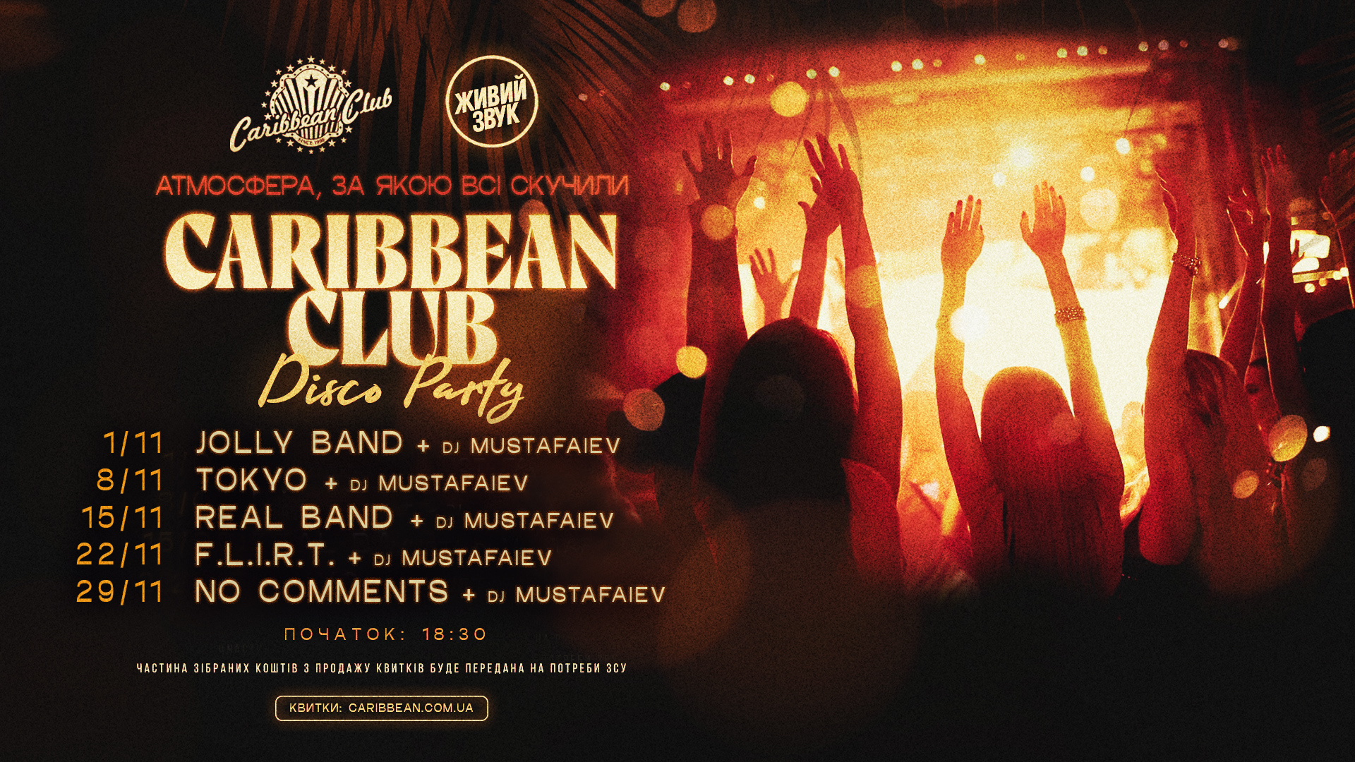 Щосуботи Caribbean Club вибухатиме фірмовими Caribbean Disco Party — вечірками, де тропічні ритми поєднуються з енергією світових танцювальних хітів. На сцені виступлять кавер-гурти F.L.I.R.T., TOKYO та REAL BAND, а DJ Mustafaev триматиме танцмайданчик у постійному русі. Це живий звук, драйв і атмосфера, у якій хочеться забути про час.