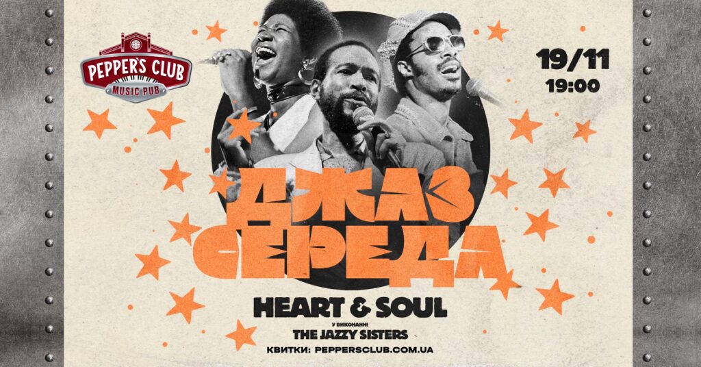 19 листопада в Pepper’s Club — концерт The Jazzy Sisters із live-бендом і програмою Heart & Soul. Наживо пролунають хіти золотої епохи соулу 60-х: Sunny, Ain’t No Mountain High Enough, Don’t You Worry ’Bout a Thing, Bring It On Home to Me та інші композиції легендарних артистів — від Сема Кука і Марвіна Ґея до Арети Франклін і Стіві Вандера.