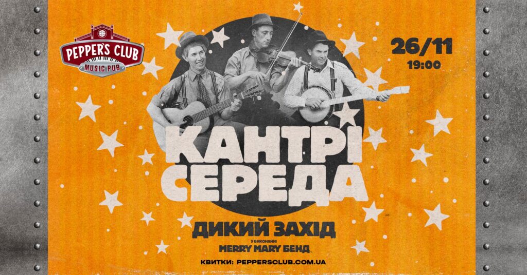 Гурт Merry Mary Band запрошує в музичну подорож від паризьких вуличок до танцмайданчиків Америки. У програмі кантрі-середи «Дикий Захід» — суміш свінгу, французького манушу, діксі та джазової класики. Слайд-гітара й кантрі-скрипка створять справжнє звучання вестерн-свінгу, що перенесе атмосферу Америки 50-х просто на сцену Pepper’s.