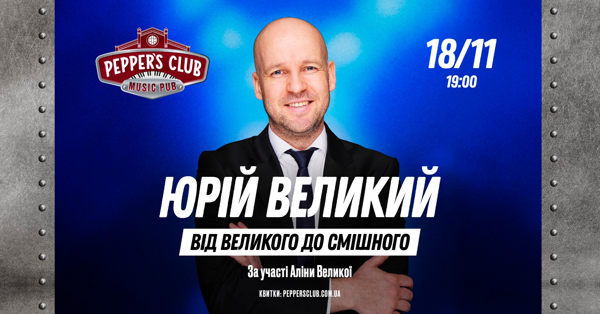 18 листопада в Pepper’s Club пройде сольний концерт Юрія Великого, актора, коміка й пародиста, відомого за студією «Квартал 95». Його нова програма «Від великого до смішного» — це пародії на політиків і зірок, музичні номери, імпровізації й гострі спостереження за життям країни. У виступі бере участь дружина й партнерка коміка — Аліна Велика.