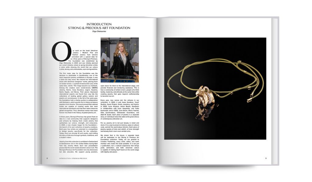 Книга присвячена ювелірам, дизайнерам і художникам, які працюють у сфері прикрас, та охоплює творчість 33 учасників. Серед них представлені знані ювелірні бренди, індивідуальні дизайнери, студії, що працюють із дорогоцінним камінням та металами, fashion-креатори, керамісти та автори, які експериментують з оригінальними матеріалами. Видання опубліковано за інформаційної підтримки Арт Фонду Strong & Precious, який був заснований Ольгою Олексенко у 2022 році й за ці роки виріс до справжньої спільноти, що підтримує дизайнерів і майстрів.