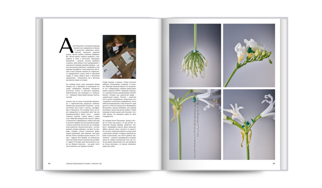 Найбільший розділ видання присвячений дизайнерам і студіям, які працюють з дорогоцінним камінням, металами та сплавами, поєднуючи повагу до традицій з оригінальною візуальною стилістикою. Окремий акцент у книзі зроблено на розвитку галузі після початку повномасштабного вторгнення: деякі бренди були засновані в період глибокого переосмислення. Є і ті, хто змінив ювелірну діяльність на службу в лавах ЗСУ, як-от ювелір Антон Бойко.
