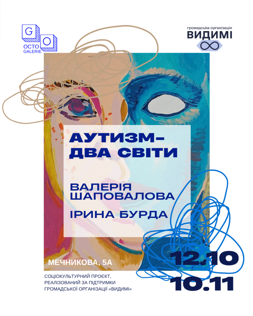 12 жовтня у київській галереї Octo Galerie (вул. Мечникова, 5а) відкрилася виставка «Аутизм два світи». Вона створена художницями Валерією Шаповаловою та Іриною Бурдою за підтримки громадської організації «Видимі».