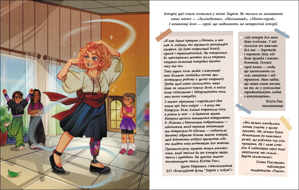 У цій історії визнають біль і складність. Показують право дитини на мовчання й злість. Допомагають зрозуміти, чому «підтримка» іноді ранить. Пропонують чесний, людяний погляд на життя після травми. Найсильніший момент книжки — листи людей з протезами, які пройшли те саме. Вони говорять «Я був/була там, де ти зараз». Життя після травми існує. Як раніше — не буде, але «інакшість» може стати силою, хоча й не одразу.