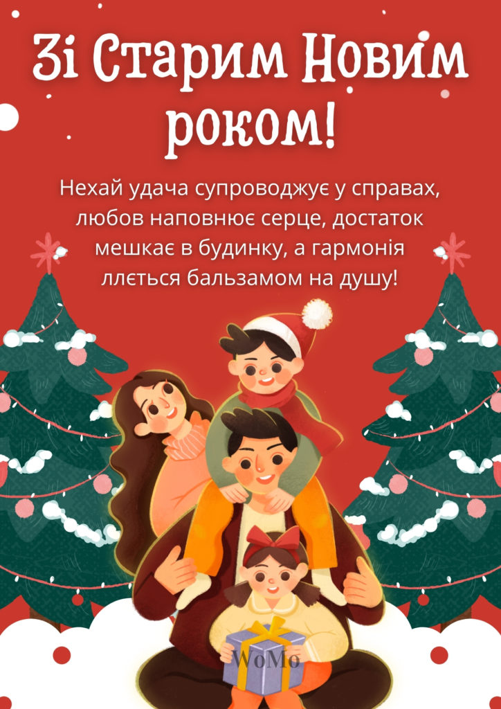Вітаю зі Старим Новим роком. Нехай старий рік забере всі хвороби, печалі і негаразди, а новий нехай подарує удачу, здоров’я, благополуччя і щастя. Нехай в домі завжди буде весело і затишно, а на душі — спокійно і світло.